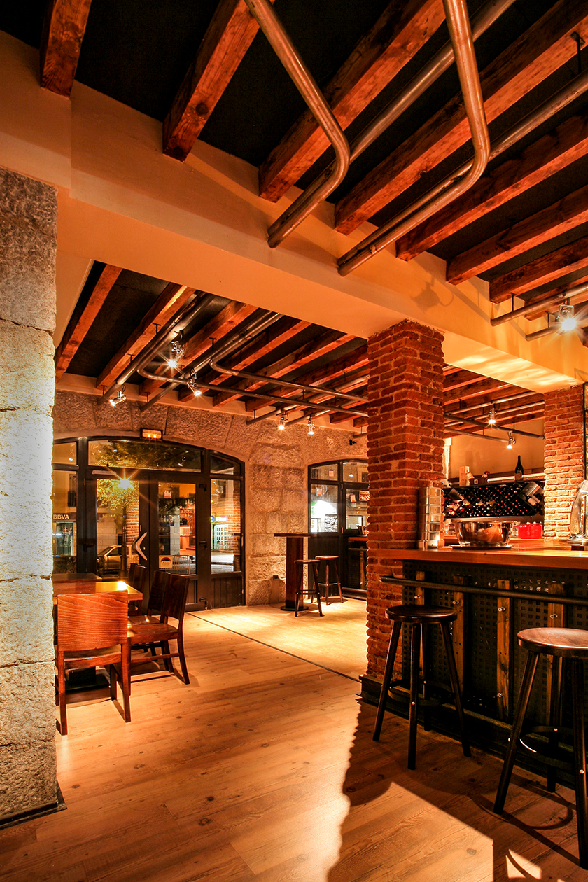 A petición del cliente, el diseño interior pretendía simular una estación de tren que el pueblo nunca tuvo. Se generan diferentes espacios, unos simulan estar en un vagón de tren, un diseño de madera y acero donde las traviesas de tren recorren toda la barra principal o una caja de madera apilada donde te adentras en los baños. La iluminación hace un recorrido por todo el espacio como si de unas vías se trataran, dejando las vigas originales del forjado a modo de traviesas.